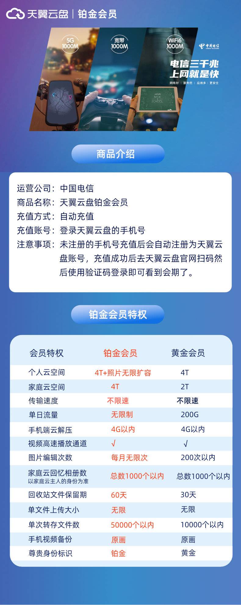 【自动充值】天翼云盘铂金会员3个月-老顾客