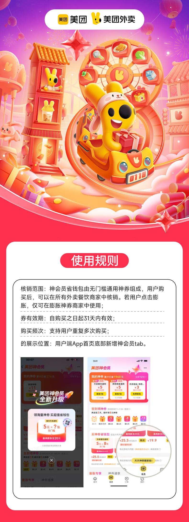 【自动充值】美团外卖神会员『30元券包』丨5元*3张+25-5*3张-老顾客